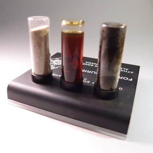 This rare and unusual tourist souvenir consists of a metal base with samples of the oil sands, the processed oil known as 'synthetic crude', and the resulting sand residue.