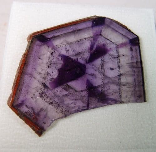 Part of a thin, cut and polished slice through an amethyst crystal showing colour zoning.