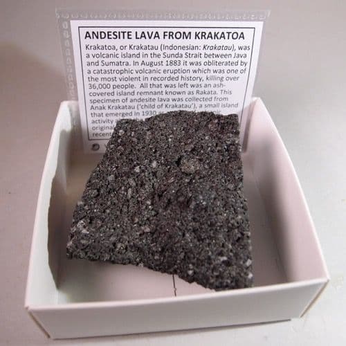 This specimen of andesite lava was collected from Anak Krakatau (‘child of Krakatau’), a small island that emerged in 1930 as a result of volcanic activity along the submerged northern rim of the original caldera. This island is still active, its most recent eruptive episode having begun in 1994.