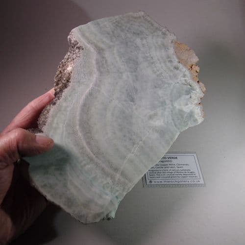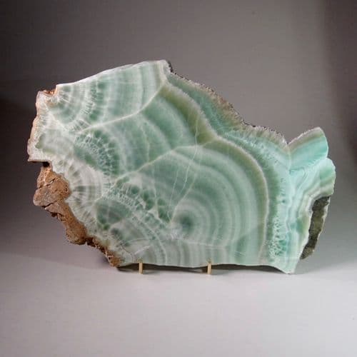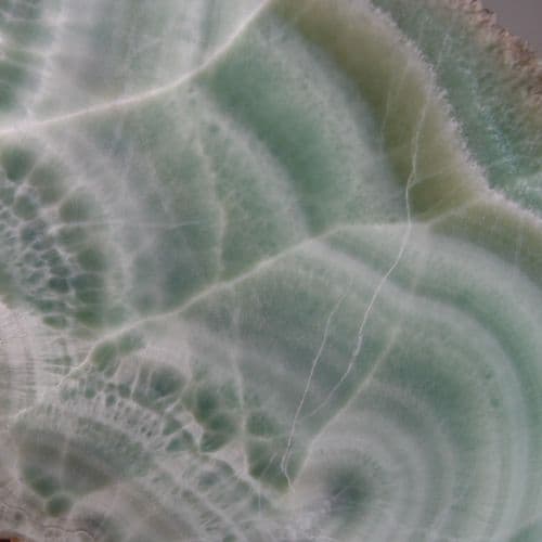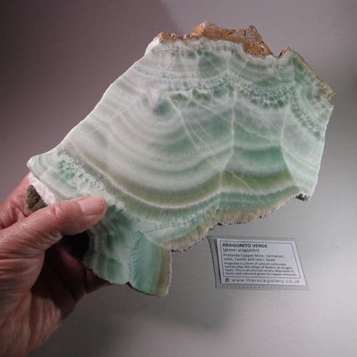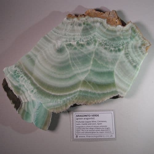 Aragonite is a form of calcium carbonate named after the village of Molina de Aragón, Spain. This is an unusual variety deposited in layers and coloured green by copper minerals.