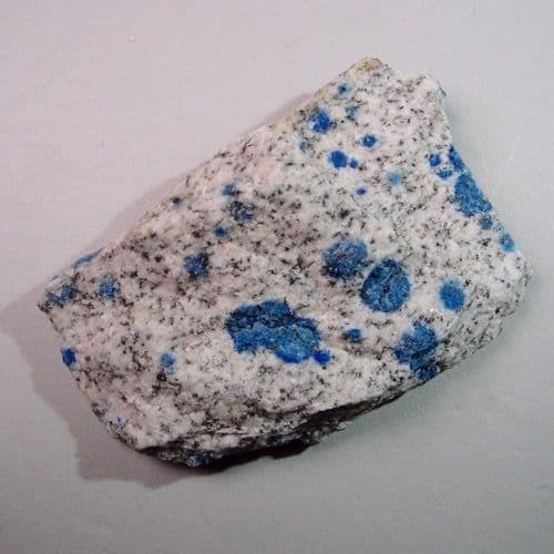 Spherical areas of blue azurite (copper carbonate) within fine-grained granite. This extremely unusual rock is commonly called ’K2 stone’ because it is found near K2, the second highest mountain in the world. It is also erroneously called ‘K2 jasper’, but it is a granite, not a jasper.