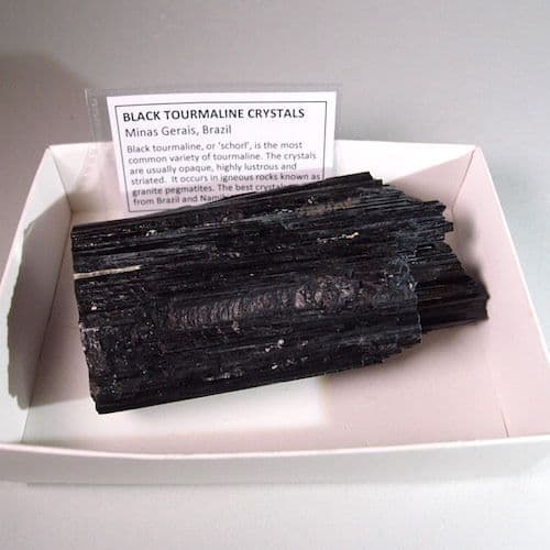Black tourmaline, or ‘schorl’, is the most common variety of tourmaline. The crystals are usually opaque, highly lustrous and striated. It occurs in igneous rocks known as granite pegmatites. The best crystals come from Brazil and Namibia.