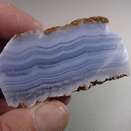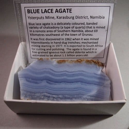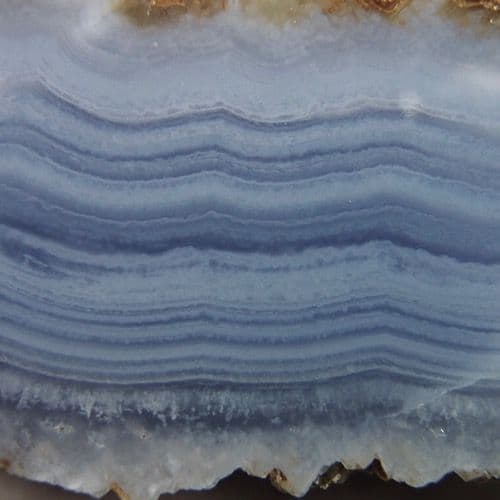 Blue lace agate is a delicately coloured, banded variety of chalcedony (a type of quartz) that is mined in a remote area of Southern Namibia, about 69 kilometres southwest of the town of Grunau.
