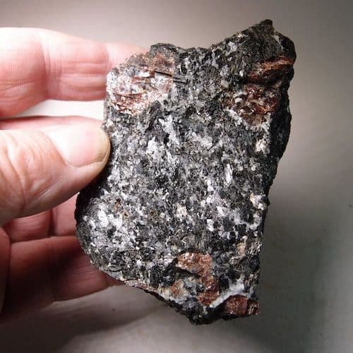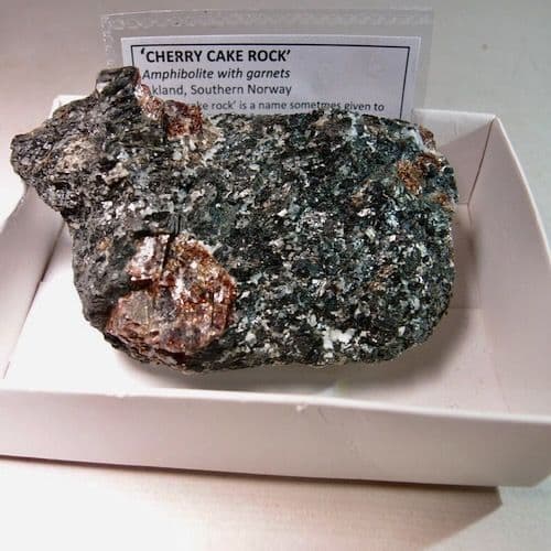 ‘Cherry cake rock’ is a name sometmes given to an amphibolite rock from Southern Norway, characterized by red almandine garnet crystals embedded in a black hornblende and white plagioclase feldspar matrix, reminiscent of cherries in a cake.