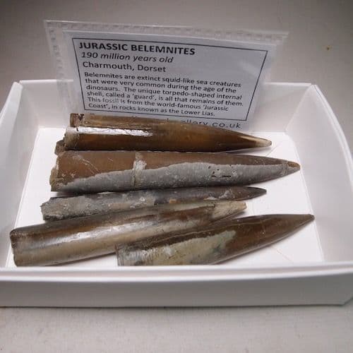 Belemnites are extinct squid-like sea creatures that were common during the age of the dinosaurs, a period of the Earth's history when much of England was submerged beneath warm seas. Their bullet-shaped internal shell, called a guard, is all that remains of them.