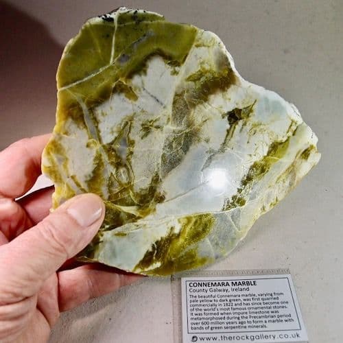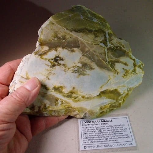 The beautiful Connemara marble, varying from pale yellow to dark green, was first quarried commercially in 1822 and has since become one of the world’s most famous ornamental stones.
