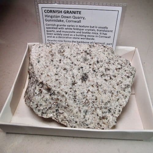 Cornish granite varies in texture but is usually speckled with white feldspar crystals, translucent quartz, and muscovite and biotite mica. It has been widely used as a building stone in Cornwall and as a decorative stone worldwide.