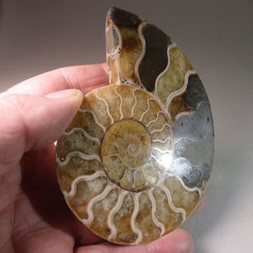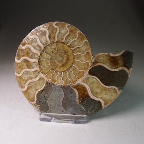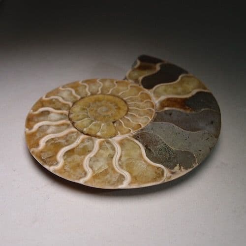 A section of an ammonite cut and polished to reveal the inner chambers of the original shell. The chambers have been infilled with crystals of the mineral calcite.