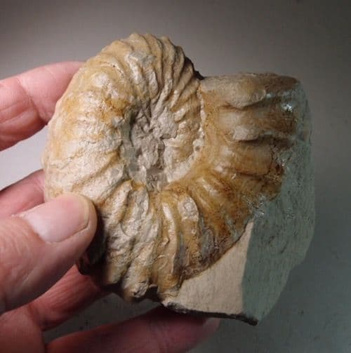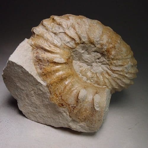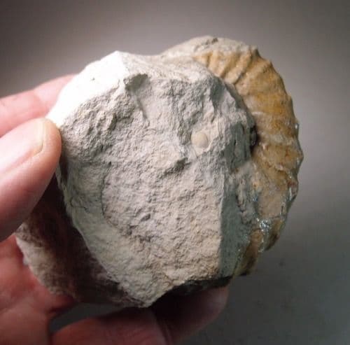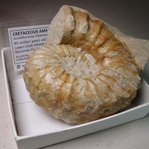 An ammonite from the Lower Chalk of Sussex, preserved in a block of chalk.