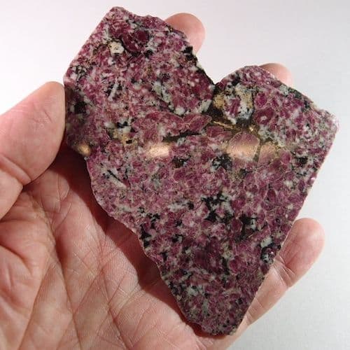 Eudialyte is a fairly rare mineral, usually red in colour, that is used as a gemstone. It occurs in alkaline igneous rocks, such as syenite, which can be very attractive when cut and polished. Eudialyte is also a minor ore of zirconium.
