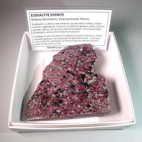 Eudialyte is one of several hundred minerals that occur in the complex igneous intrusions of the Kola Peninsula - a remote area in the far northwest of Russia that lies almost entirely north of the arctic circle.