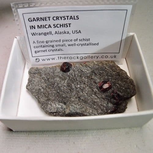 A small, but nice little specimen of fine-grained mica schist containing tiny, well-crystallised garnet crystals.