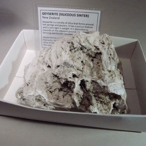 Geyserite is a variety of silica that forms around hot springs and geysers. It has a porous texture and is very light in weight.