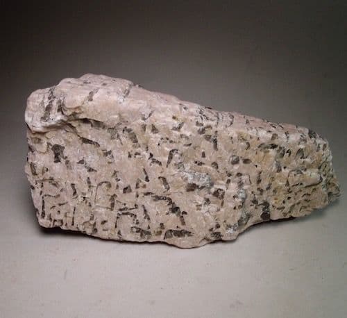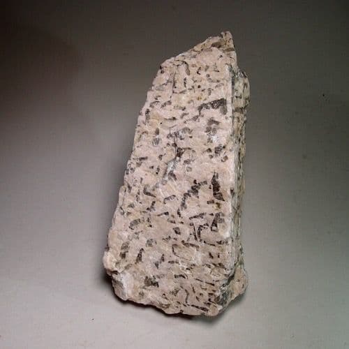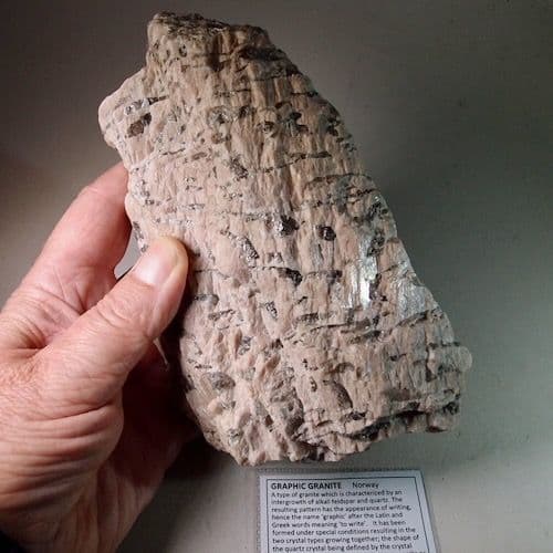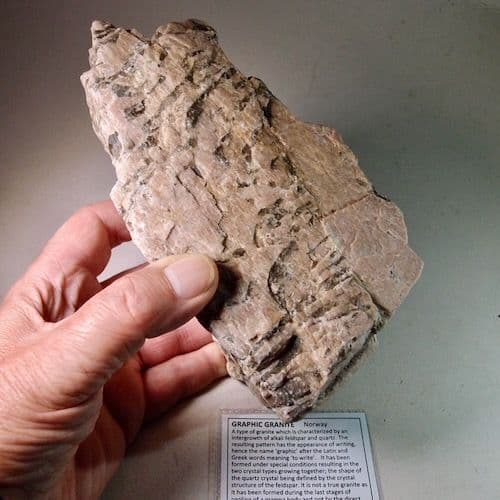 Graphic granite is a fascinating igneous rock that is characterised by an intergrowth of alkali feldspar and quartz. The resulting pattern has the appearance of writing, hence the name ‘graphic’ after the Latin and Greek words meaning ‘to write’.
