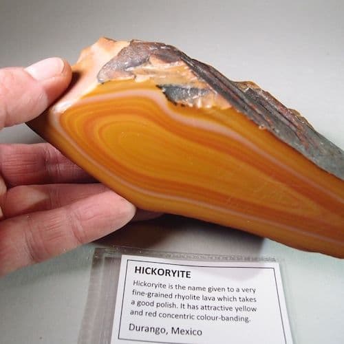 Hickoryite is the name given to a very fine-grained rhyolite lava which takes a good polish. It has attractive yellow and red concentric colour-banding.