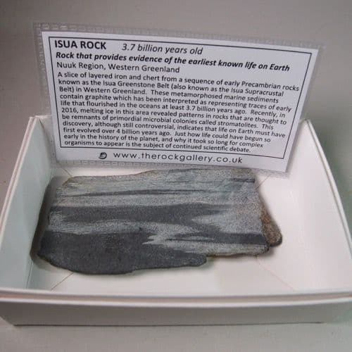 A slice of layered iron and chert from a sequence of early Precambrian rocks known as the Isua Greenstone Belt (also known as the Isua Supracrustal Belt) in Western Greenland.