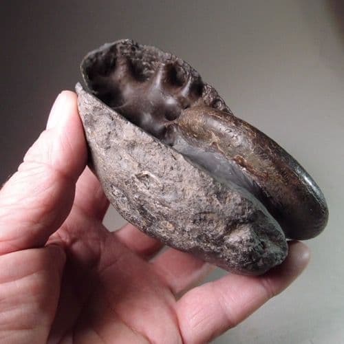 The aperture of the ammonite has been skilfully prepared to reveal the final chamber wall which is sometimes known as a ‘cat’s paw’ due to the superficial resemblance.