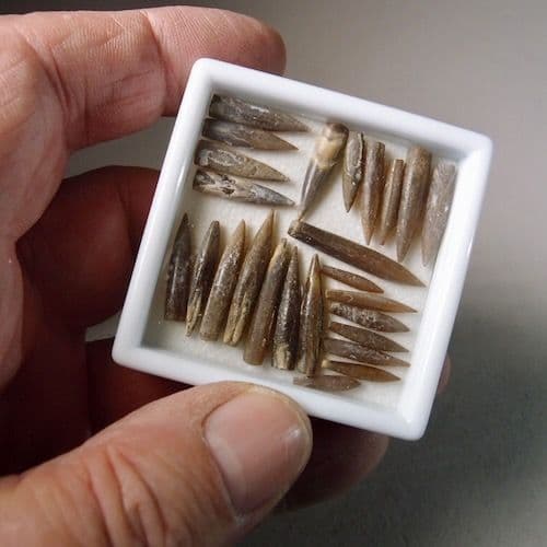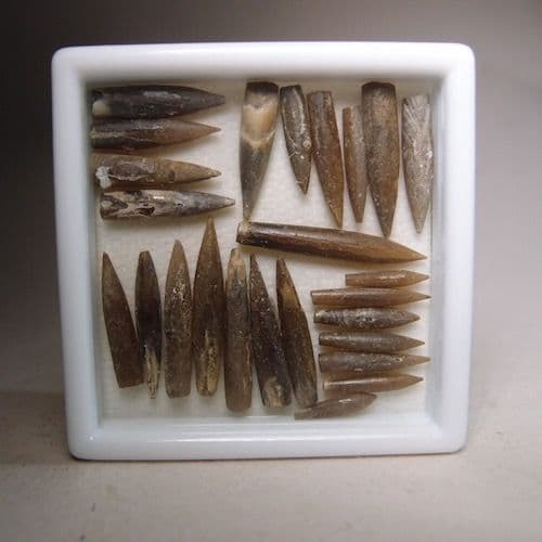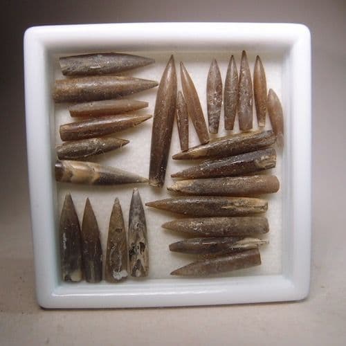 A collection of little belemnites from the foreshore at Tidmore Point. They were collected in 1974 and are from an old collection. Presented in a glass topped display box.