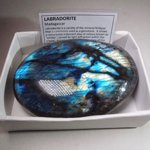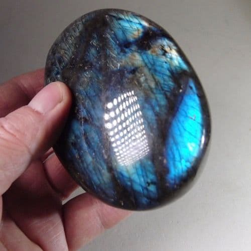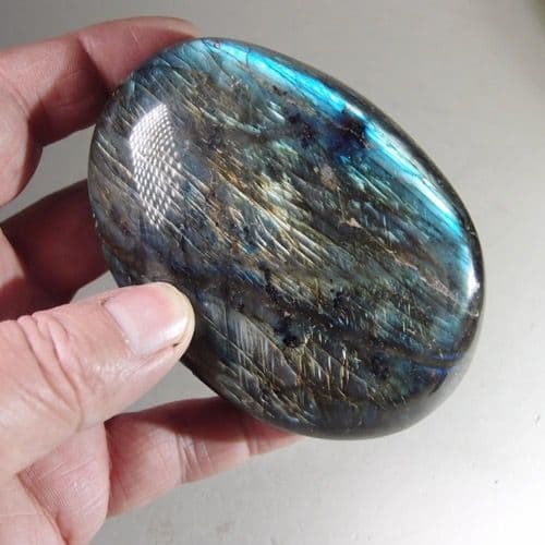This is a large, hand-polished labradorite 'pebble', carved into a pleasing oval palm stone shape. There are some minor chips and marks but these do not distract from its beauty.