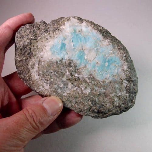 Larimar is a rare blue variety of the mineral pectolite, found only in the Dominican Republic. Although originally found in 1916, it was rediscovered in 1974 and given the name larimar, which incorporates mar, the Spanish word for sea, due to its colour.