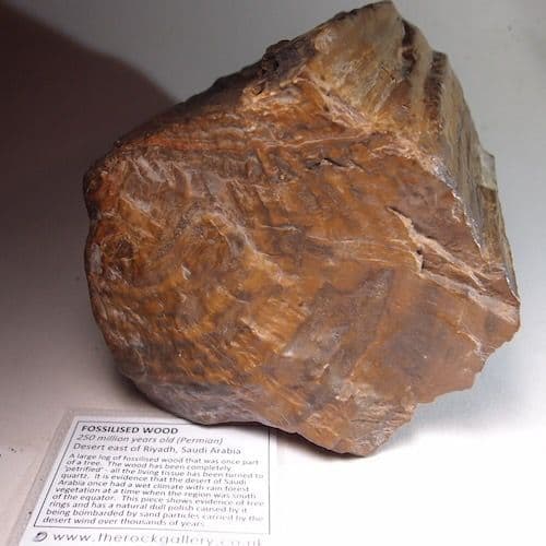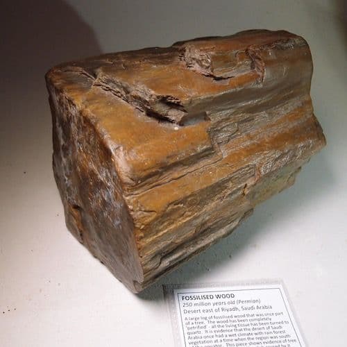 A large log of fossilised wood that was once part of a tree. The wood has been completely 'petrified' - all the living tissue has been turned to quartz. It is evidence that the desert of Saudi Arabia once had a wet climate with rain forest vegetation at a time when the region was south of the equator.