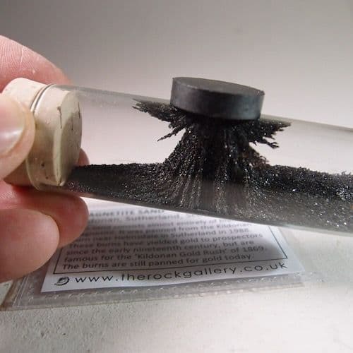 This sand is almost entirely black magnetite. it was panned from the Kildonan Burn near Helmsdale in Sutherland in 1988. It is from an old collection.