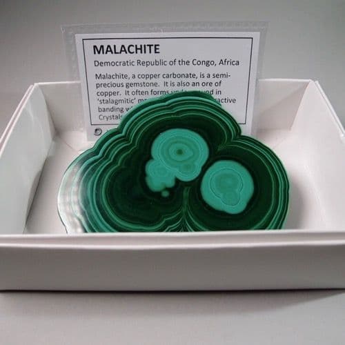 Malachite, a copper carbonate, is a beautiful green, banded semi-precious gemstone.