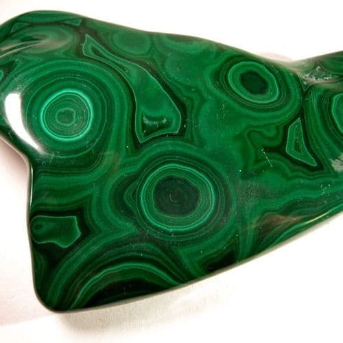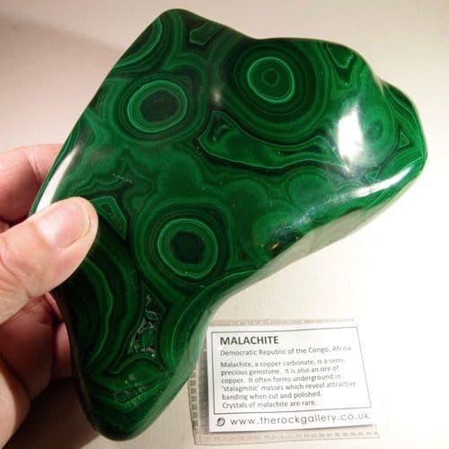 Malachite, a copper carbonate, is a beautiful green, banded semi-precious gemstone. It is also an ore of copper. It forms deep underground in 'stalactitic' (banded) masses.
