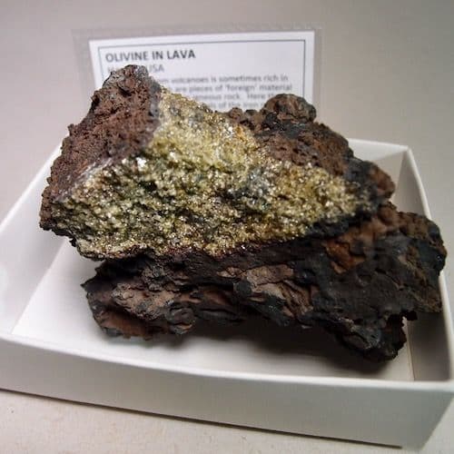 The lava fields of Hawaii contain ‘xenoliths’ which is the word used to describe pieces of ‘foreign’ material found as inclusions in igneous rock. Here the xenoliths consist of a mass of crystals of the iron mineral olivine within basalt lava.