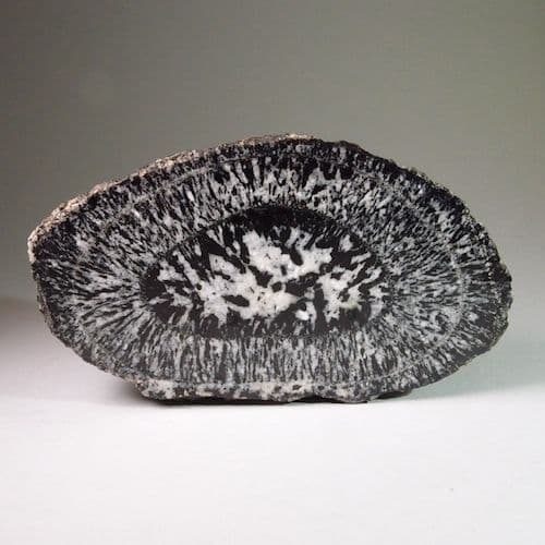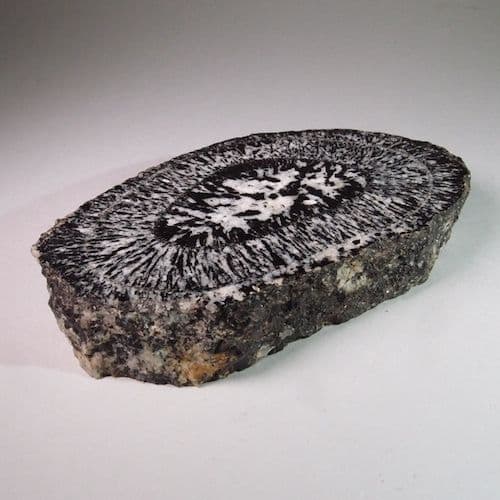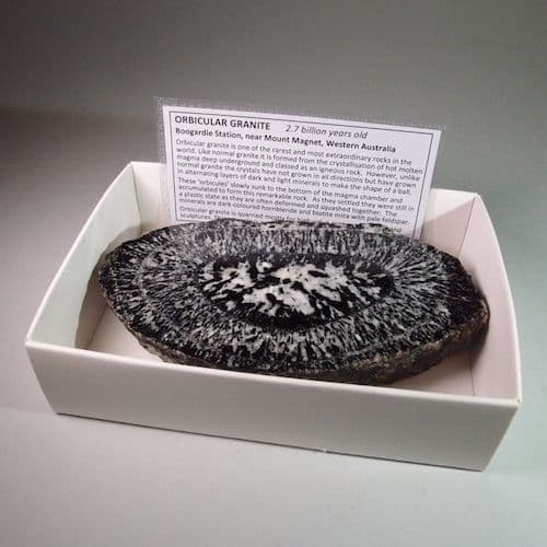 Orbicular granite is one of the rarest and most extraordinary rocks in the world. Like normal granite it is formed from the crystallisation of hot molten magma deep underground and classed as an igneous rock. However, unlike normal granite the crystals have not grown in all directions but have grown in alternating layers of dark and light minerals to make the shape of a ball.