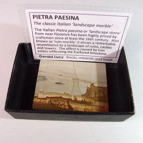 The Italian Pietra paesina or ‘landscape stone’ from near Florence has been highly prized by craftsmen since at least the 16th century. Also known as ‘ruin marble’ it shows a remarkable resemblance to a landscape of ruins, castles, towers and cliifs.