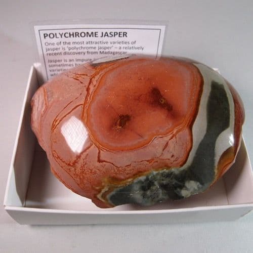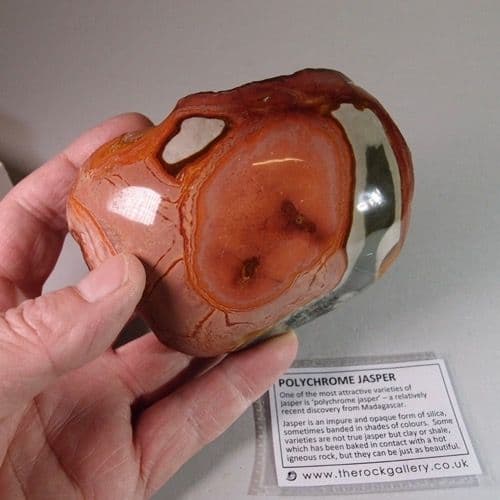 One of the most attractive varieties of jasper is ‘polychrome jasper’ – a relatively recent discovery from Madagascar. This example is polished on one side only so that the natural colour and texture of the rock can also be seen.