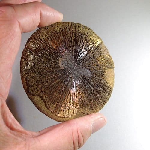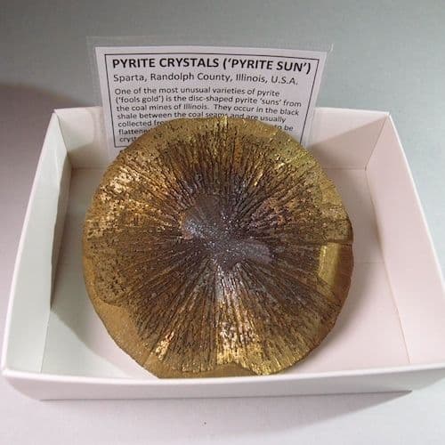 One of the most unusual varieties of pyrite (‘fools gold’) is the disc-shaped pyrite ‘suns’ from the coal mines of Illinois. They occur in the black shale between the coal seams and are usually collected from the mine tips.