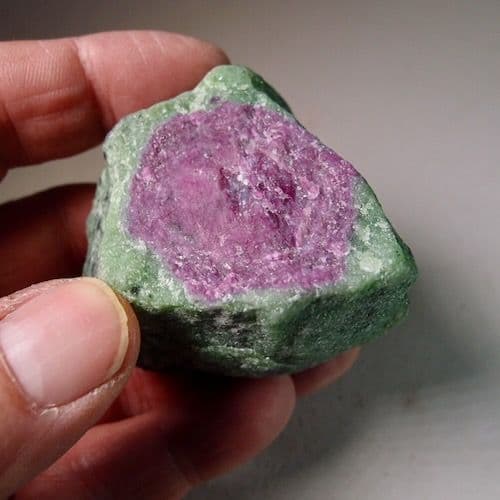 The rubies are not gem quality but their colour provides a stunning contrast to the zoisite. This example has one very large crystal and several smaller crystals.