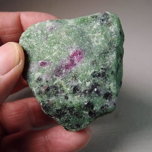 One of the world’s most striking rocks consists of red ruby crystals in green zoisite with varying amounts of the black mineral pargasite. It comes from Longido, near Mount Kilimanjaro and is called ‘anyolite’ after the local Masai word for green.