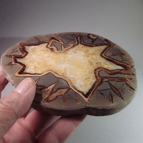 Septarian nodules, or 'septaria', are remarkable natural objects. They are round concretions containing a network of internal cracks that have been filled with minerals, particularly brown and yellow calcite. No traces of the cracks are visible on the surface of the nodule.