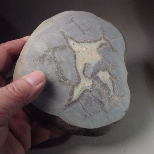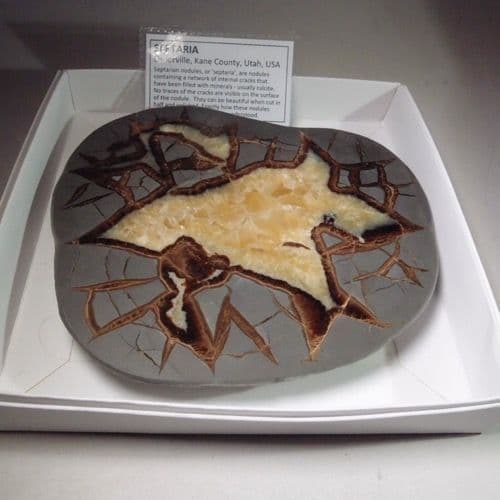 When cut and polished these nodules can be very beautiful. This example is from the classic site in Utah which has produced some of the finest septarian nodules in the world.