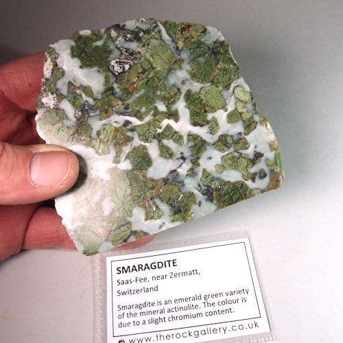 Smaragdite is an emerald green variety of the mineral actinolite. The colour is due to a slight chromium content.