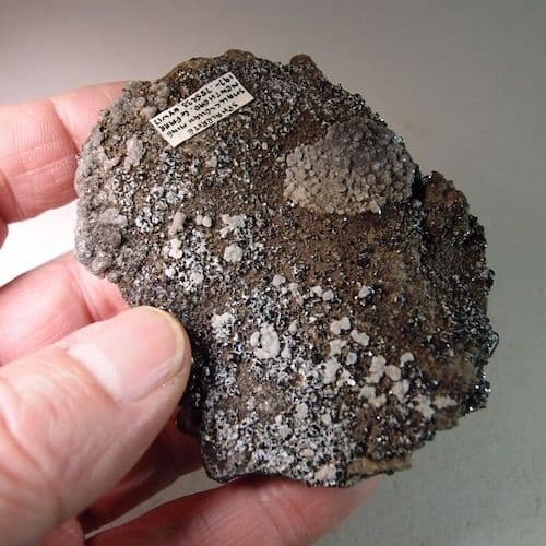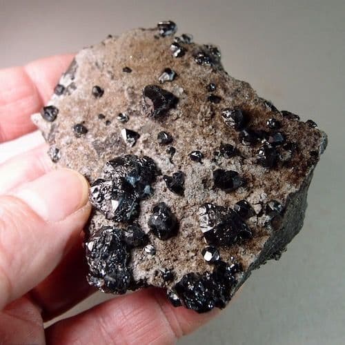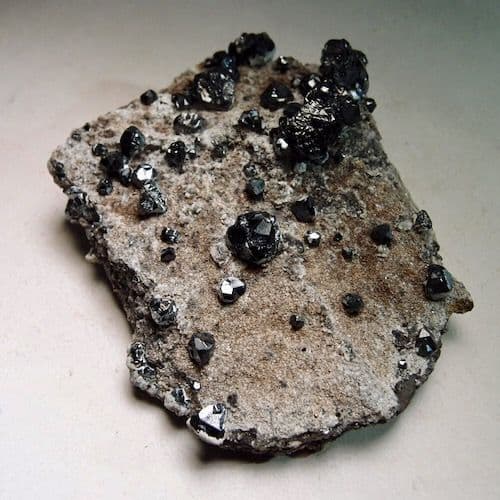 Lustrous, black crystals of sphalerite, scattered on hard limestone from this disused lead mine in the northern Pennines.