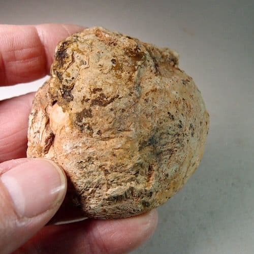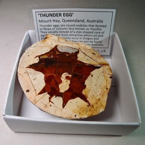 Thunder eggs are round nodules that formed in flows of volcanic lava known as rhyolite. They usually consist of a star-shaped core of agate and are most attractive when cut and polished. They mostly occur in Oregon and Nevada in the USA but they can also be found elsewhere, such as this example from Australia.