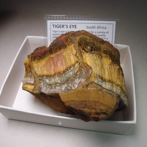 Tiger’s eye is the name for a variety of quartz which has a remarkable optical quality called ‘chatoyancy’, where light is reflected in a particular way due to the fibrous structure of the mineral. The effect is similar to the sheen off a spool of silk with the streak of reflected light always perpendicular to the direction of the fibres.