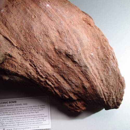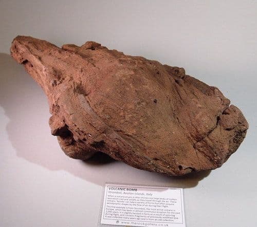 This fine example is from Stromboli, the most active volcano in Europe, which has been in almost continuous eruption for the past 2,000 years. It is slightly twisted in form as a result of spinning during flight, and contains fragments of previously solidified lava.