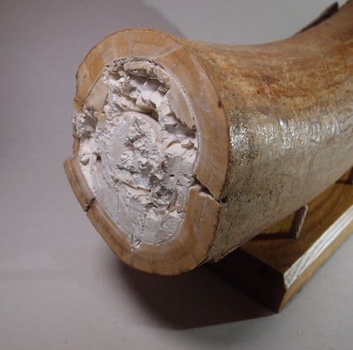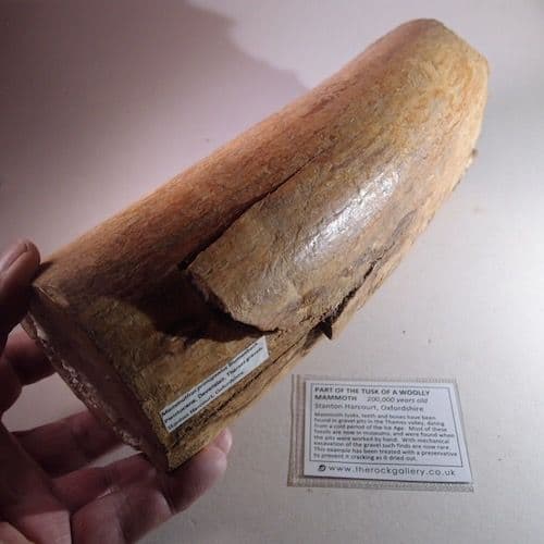 Mammoth tusks from gravel pits are only partially fossilised and require treatment with a preservative. This tusk has been treated and is now stable. However it is advisable to keep it away from sources of direct heat such as sunlight or a radiator.