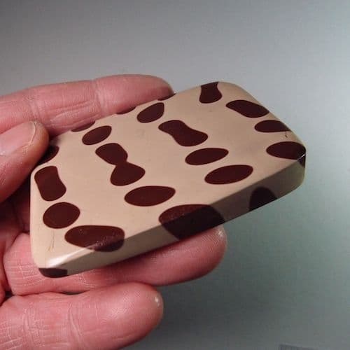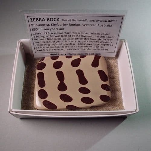 The iron diffused through the porous rock in pulses or waves creating distinct bands that scientists call ‘Liesegang rings’ but it is still not clear exactly how they are formed. The rock is very compact and fine-grained - resembling unglazed porcelain – and known by geologists as a siliceous argillite. Zebra rock is sometimes used for jewellery or carved into decorative items.